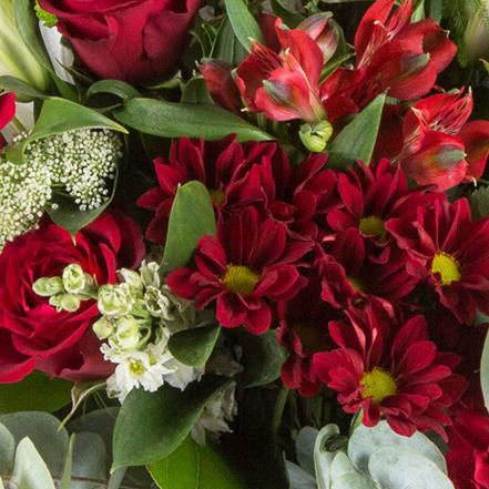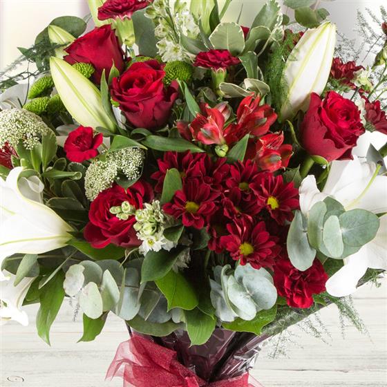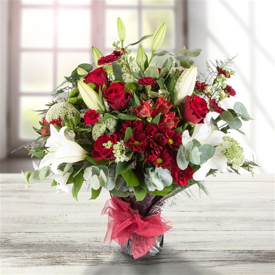 An exotic collection including red roses, oriental lilies with a variety of red and lime blooms and foliage.