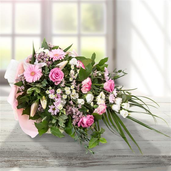 A traditional style bouquet in shades of pink and cream, including roses, chrysanthemums, lisianthus & limonium.
